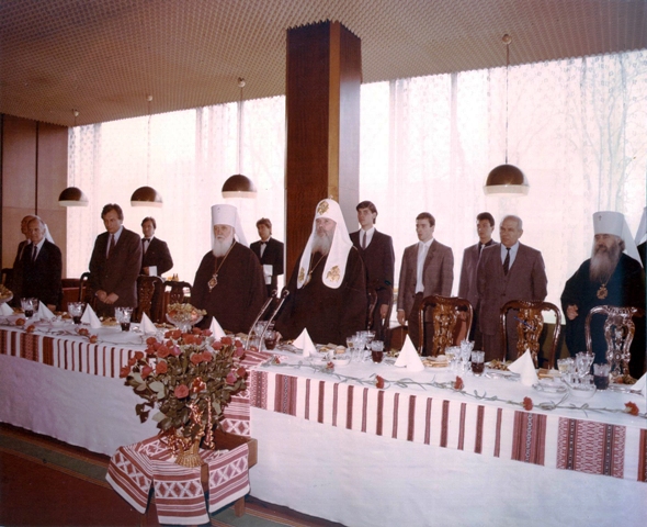направо: Президент АН УРСР Б.Патон, Заступник Голови Ради Міністрів УРСР С.Комісаренко,  екзарх України – митрополит Філарет, Патріарх Московський і Всєя Руси Алексій II. Київ, 1990.