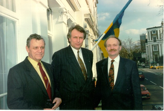28. В’ячеслав Чорновіл та онук Франка – Роланд разом з Послом – у Посольстві України. Лондон, 1994.