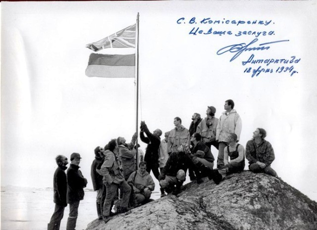 73. «Хрещений батько» української антарктичної станції «Академік Вернадський» академік С.Комісаренко з обома змінами колективу станції. Антарктика, 2010.