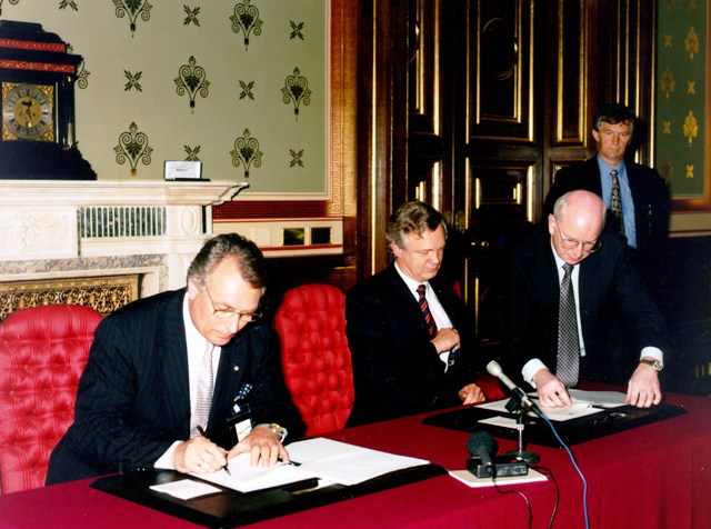 34. Посол України у Великій Британії Сергій Комісаренко та Державний міністр іноземних справ Великої Британії Дейвід Девіс підписують Меморандум про безкоштовну передачу Україні антарктичної станції «Фарадей». Лондон, Форін Офіс, 20 липня 1995.