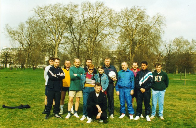 38. Футболісти посольства в Гайд Парку (серед них - три майбутні посли України – Ю.Сергєєв, М.Коваль, І.Прокопчук). Лондон, 1997