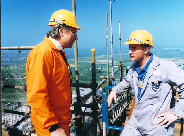 39. Посол України з британським інженером на верхівці димаря атомного реактора в Салафілді, Англія, на якому у 1955 році відбулася перша в світі аварія, подібна Чорнобильській. Салафілд, Велика Британія, 1997.