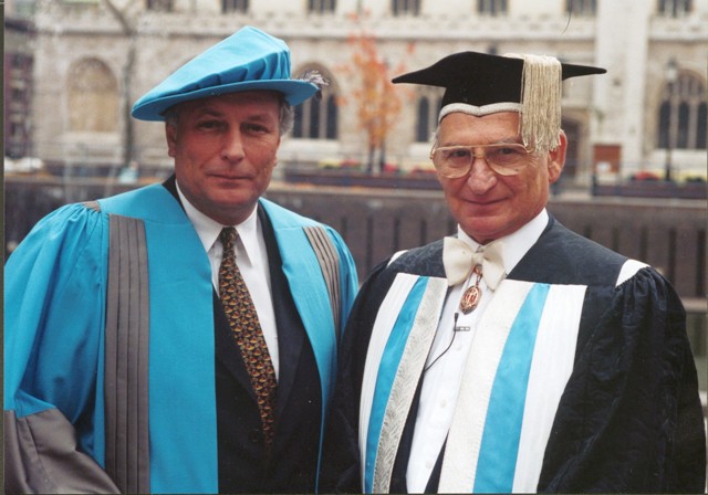 40. Після вручення диплома Почесного доктора Кінгстонського університету: разом з ректором університету сером Франком Лемплом. Барбікан, Лондон, 1997.