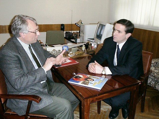 49. Директор Інституту біохімії обговорює з першим космонавтом України Леонідом Каденюком дослідження вчених Інституту для української космічної програми. Київ, 2001.