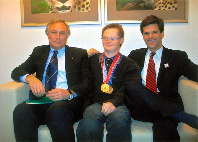 58. Президент «Спеціальної Олімпіади України» разом з атлетом СОУ Степаном Сенюковим та з Президентом «Спеціальної Олімпіади» Тімом Шрайвером (Кеннеді). Київ, 2005.