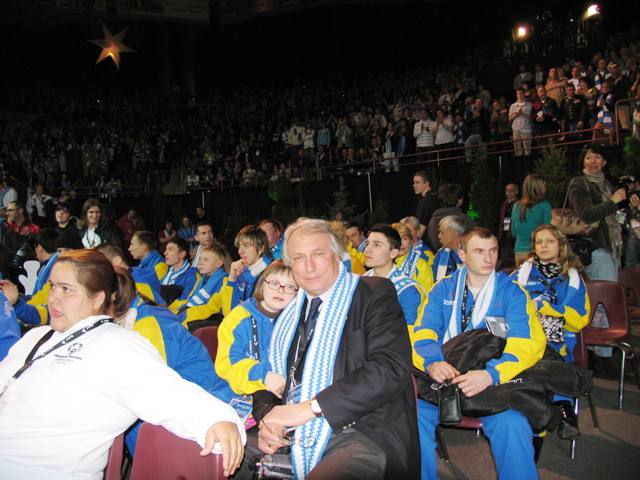 58. Президент «Спеціальної Олімпіади України» разом з атлетом СОУ Степаном Сенюковим та з Президентом «Спеціальної Олімпіади» Тімом Шрайвером (Кеннеді). Київ, 2005.