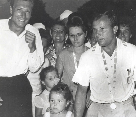 6. C.Комісаренко – «міністр спорту» гурзуфського «Супутника» вручає подарункові медалі родині Юрія Гагаріна. Крим, 1965