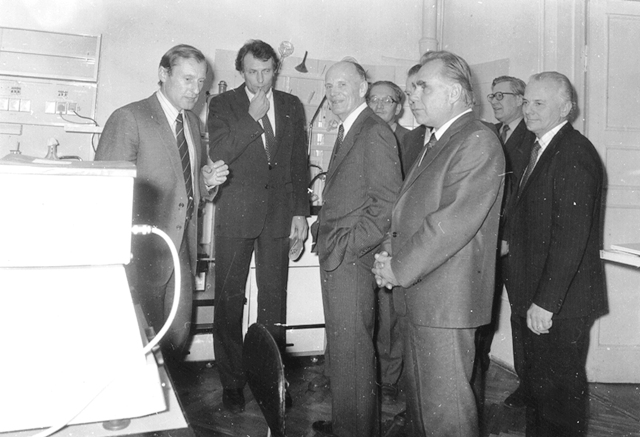 12. Президент АН УРСР, академік Б.Патон у відділі молекулярної імунології Інституту біохімії (зліва – направо: директор ІБХ В.Лішко, зав.відділом С.Комісаренко, Б.Патон, головний вчений секретар АН УРСР В.Тонкаль, віце-президент АН УРСР К.Ситник, заступник директора ІБХ В.Кокунін, віце-президент АН УРСР В.Скок). 1986.
