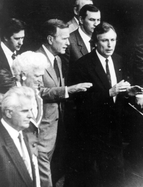 19. Віце-прем’єр-міністр УРСР С.Комісаренко розповідає Президенту США Дж.Бушу про трагедію у Бабиному Яру (поруч – пані Б.Буш, Голова Верховної Ради УРСР Л.Кравчук). Київ, Бабин Яр, 1 серпня 1991.