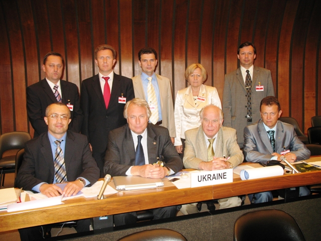 67.Делегація України на «Конвенції із заборони біологічної зброї» в Женеві (справа від глави делегації – зав.відділом МЗС України Р.Рустамов, зліва – віце-президент НАМНУ академік НАНУ Ю.Кундієв та віце-президент НААНУ академік НААНУ А.Головко. Женева, 2008.
