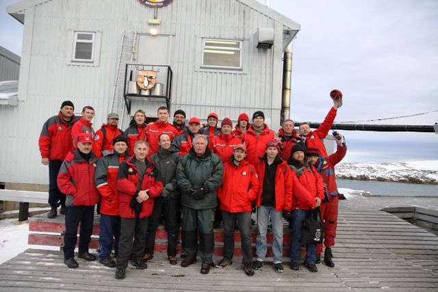 73. «Хрещений батько» української антарктичної станції «Академік Вернадський» академік С.Комісаренко з обома змінами колективу станції. Антарктика, 2010.